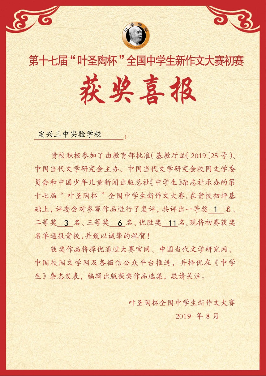 在“全国中学生英语能力竞赛”中,我校高二、高三4名同学获得了一、二等奖;在全国化学、生物竞赛中,我校高三有一名同学获得了国家级三等奖、两名同学获得了市级一等奖。在“叶圣陶杯”全国中学生新作文大赛中,我校获“组织奖”,高二年级5名同学获决赛、初赛奖励。成绩的取得来源于我校科学的管理,教师与学生共同的努力。